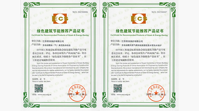 近日,經(jīng)中國工程建設標準化協(xié)會(huì )綠色建筑節能產(chǎn)品專(zhuān)家委員會(huì )審查、評定,江蘇雙良鍋爐有限公司(簡(jiǎn)稱(chēng)“雙良鍋爐”)研發(fā)生產(chǎn)的全自動(dòng)燃油(氣)真空熱水機組、全自動(dòng)燃天然氣模塊組裝超低氮水管熱水鍋爐,符合相關(guān)要求,再度被授予“綠色建筑節能推薦產(chǎn)品證書(shū)”,在工程建設領(lǐng)域推薦使用。